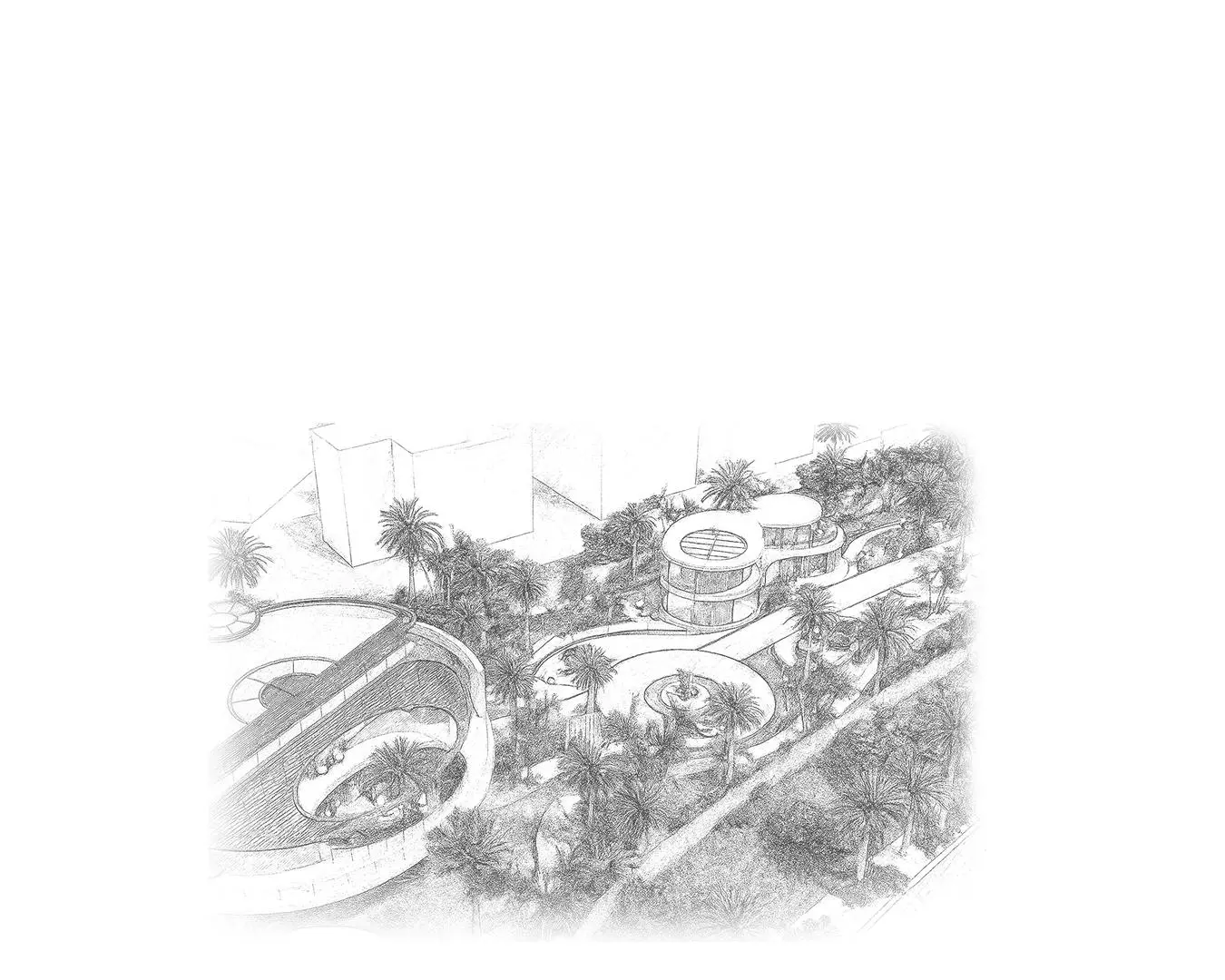 Sculpted rooflines loop around palm courts and reflective canals, guiding a gracious arrival to the circular motor court. Recessed glazing and shaded terraces temper Dubai’s sun, while limestone, timber, and brushed bronze carry the language indoors, where a sweeping helical core quietly organizes the rooms and gives the interior its calm, luxury rhythm.