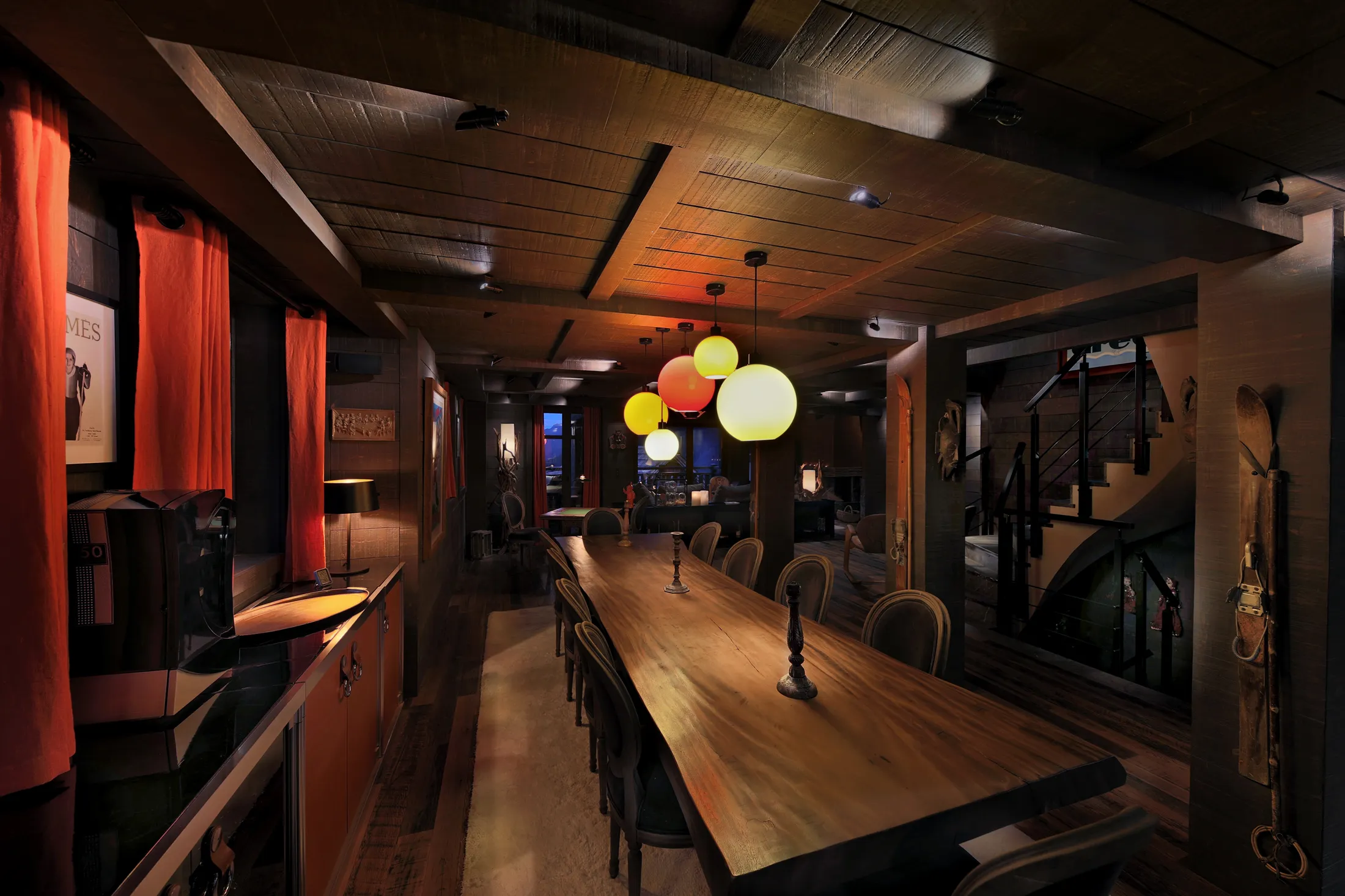 The main living level is designed around evening life after skiing. Dining, kitchen, and lounge areas are open and connected, encouraging shared moments.