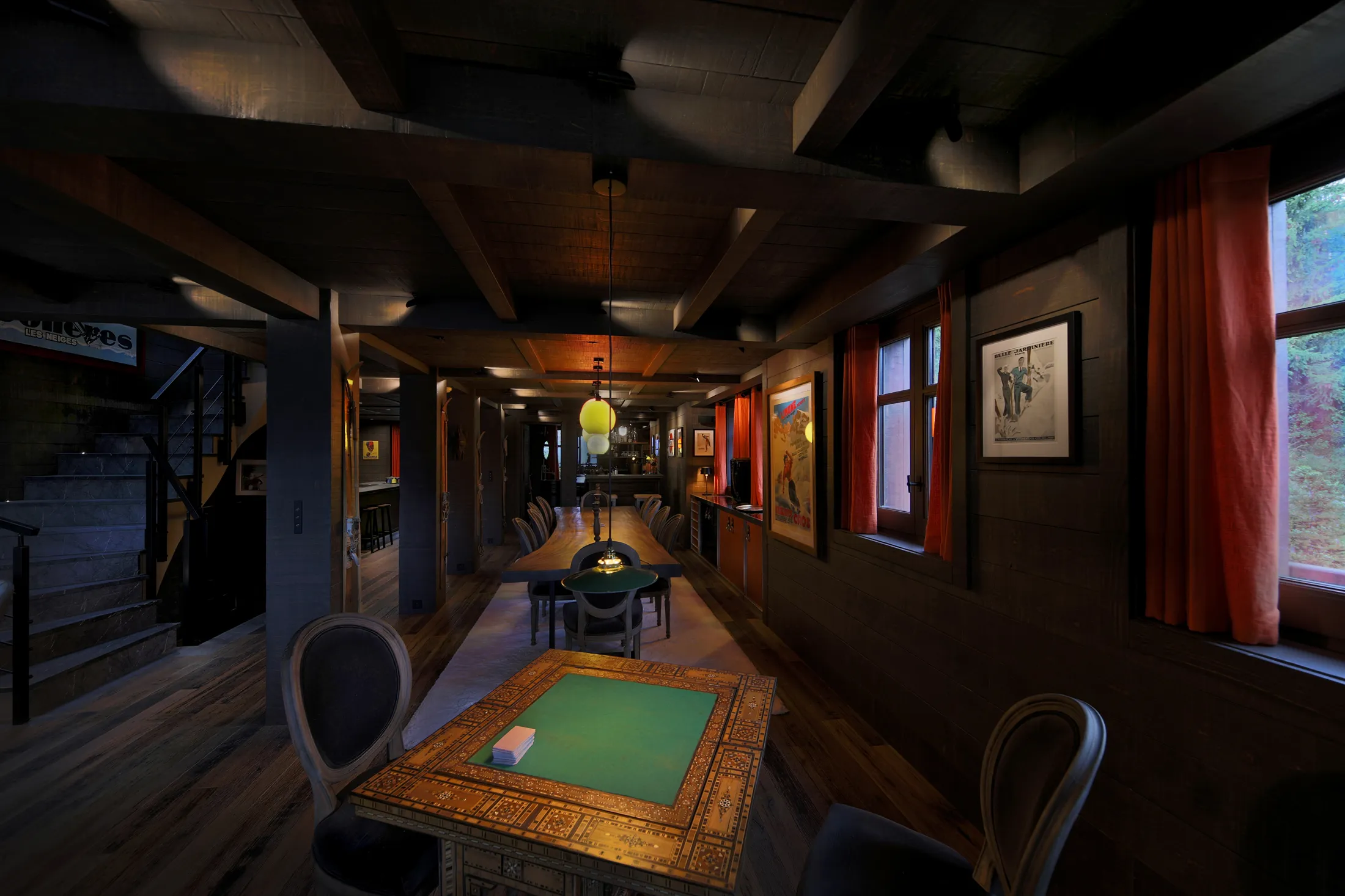 Key elements include a restored Hermès boutique cabinet, vintage game tables, reworked armchairs, and a 1930s bar with a mirrored back, each selected for its authenticity and integration within the architecture. These pieces inform the interior palette, influencing accent tones, textures, and spatial rhythm throughout the chalet.