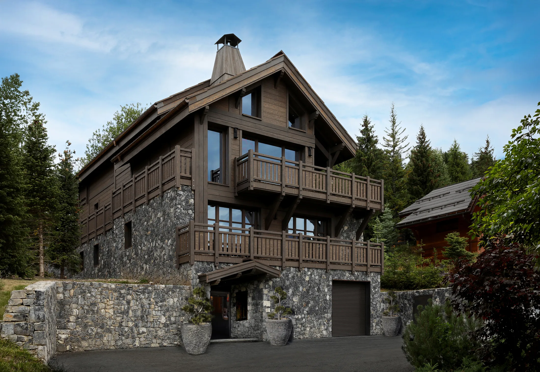 A stone base grounds the lower levels, while Jura larch wood defines the upper floors, reducing perceived height and reinforcing a contemporary alpine identity.