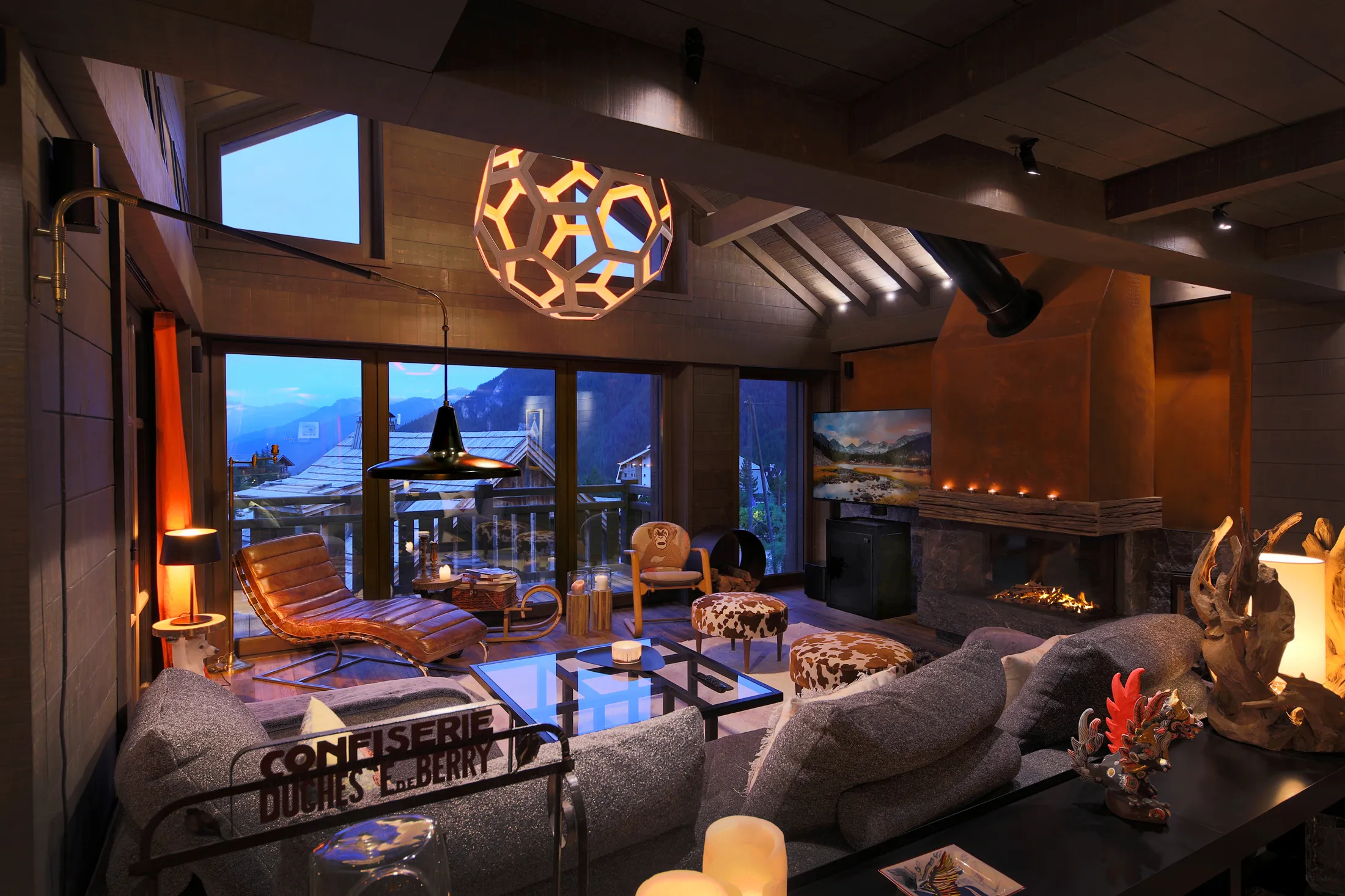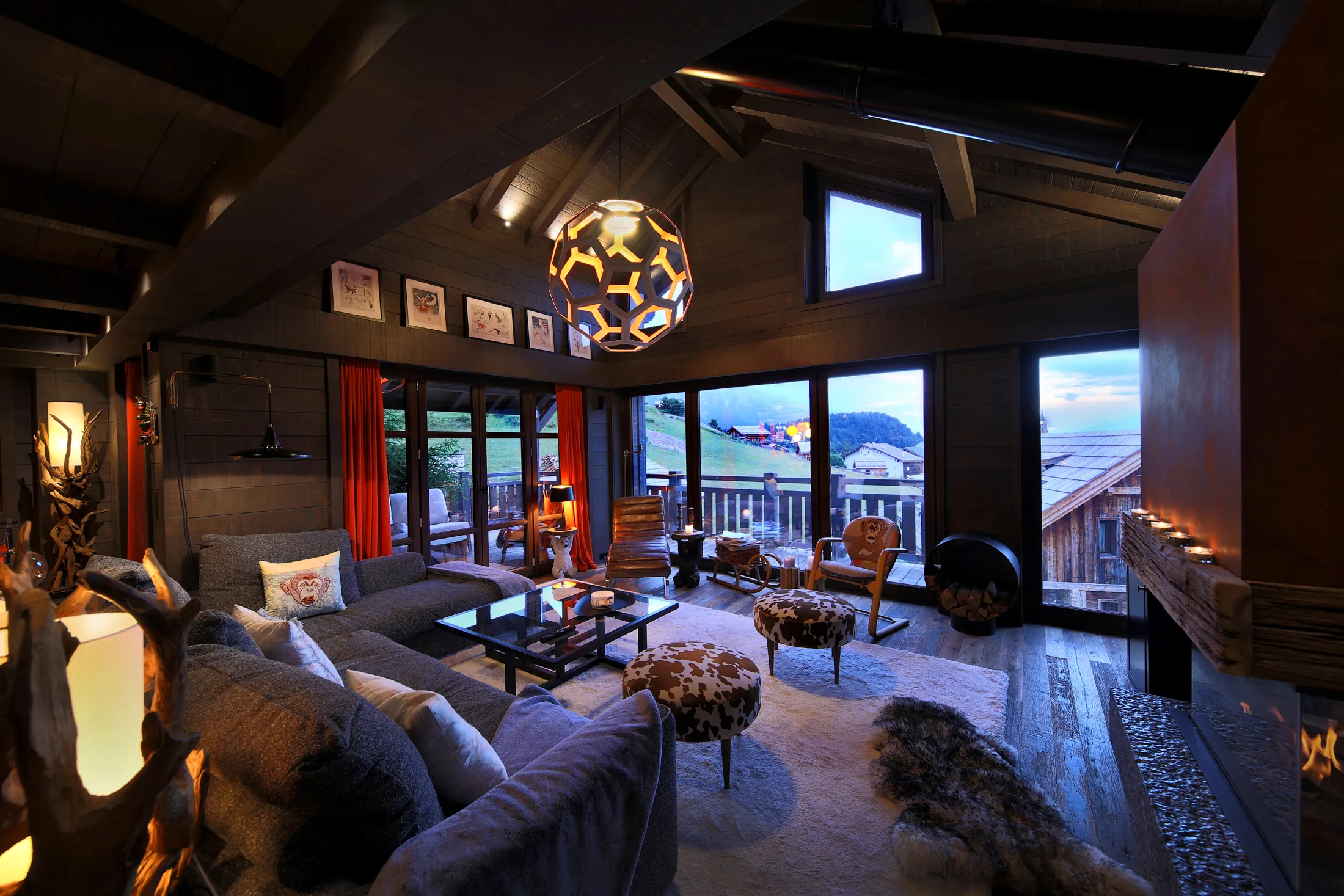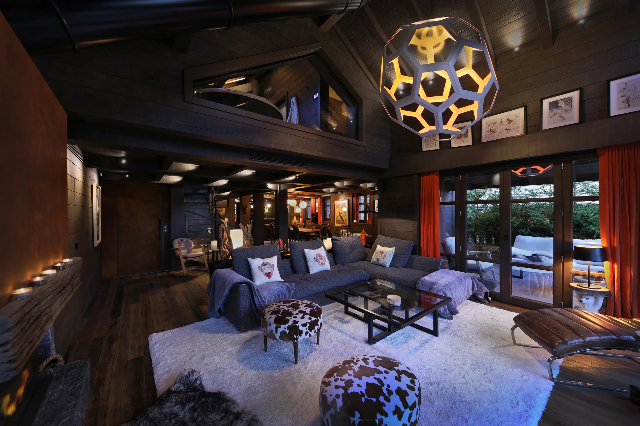 A subtle monkey motif runs throughout the interiors, offering a narrative thread without overt repetition. This playful presence gives the chalet its name, “The Monkeys Cabana,” introducing a light and unexpected identity within an otherwise refined alpine setting.