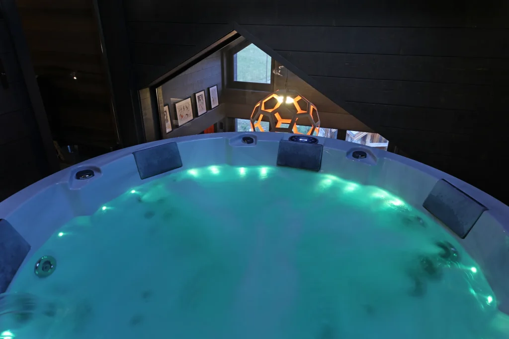 The top floor is dedicated to the master suite and a spa set beneath the exposed roof structure. A sauna and jacuzzi are integrated into this level, with roof windows and visual connections to the double-height living space below.