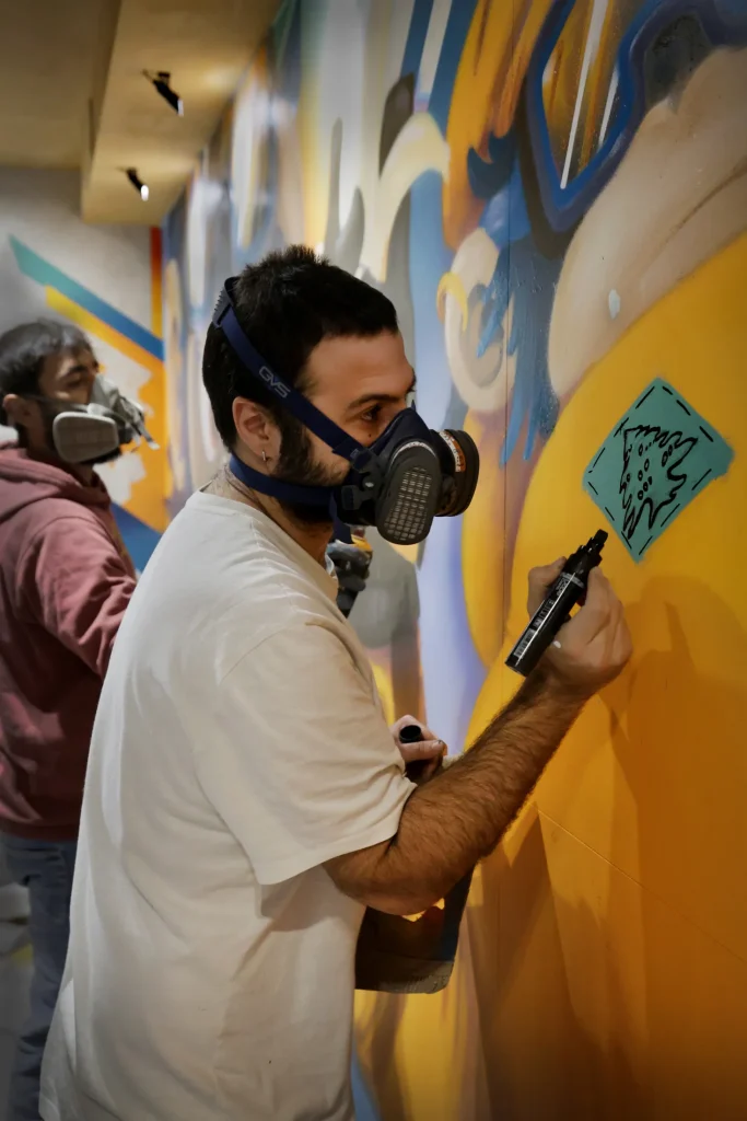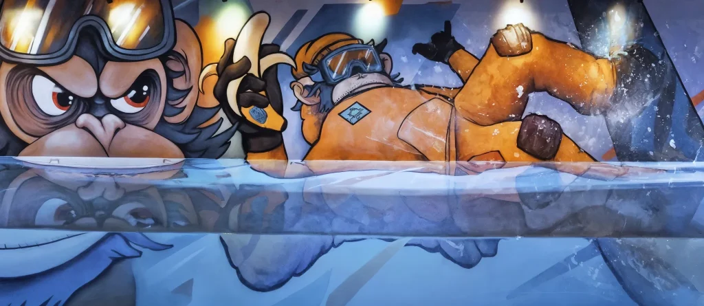 In the pool area, this narrative becomes more expressive through a large-scale mural created by two Lebanese artists. Extending from the walls to the ceiling, the artwork reinterprets the monkey theme with a bold, contemporary gesture, adding depth and contrast to the otherwise restrained material palette.