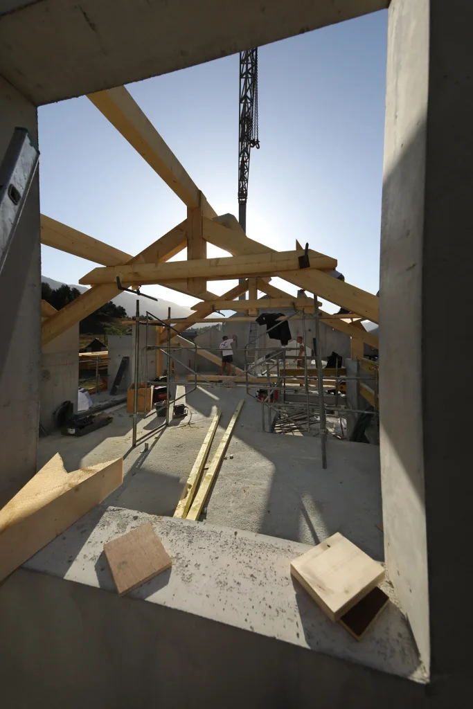 A stone base grounds the lower levels, while Jura larch wood defines the upper floors, reducing perceived height and reinforcing a contemporary alpine identity.