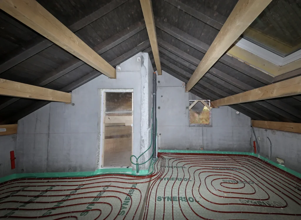 Material continuity reinforces the dialogue between old and new. Reclaimed Belgian wood flooring was adapted to modern insulation and underfloor heating, while local stone extends from the exterior into staircases and interior walls. Tinted larch wood appears on ceilings, built-ins, and headboards, establishing a warm and cohesive alpine atmosphere.