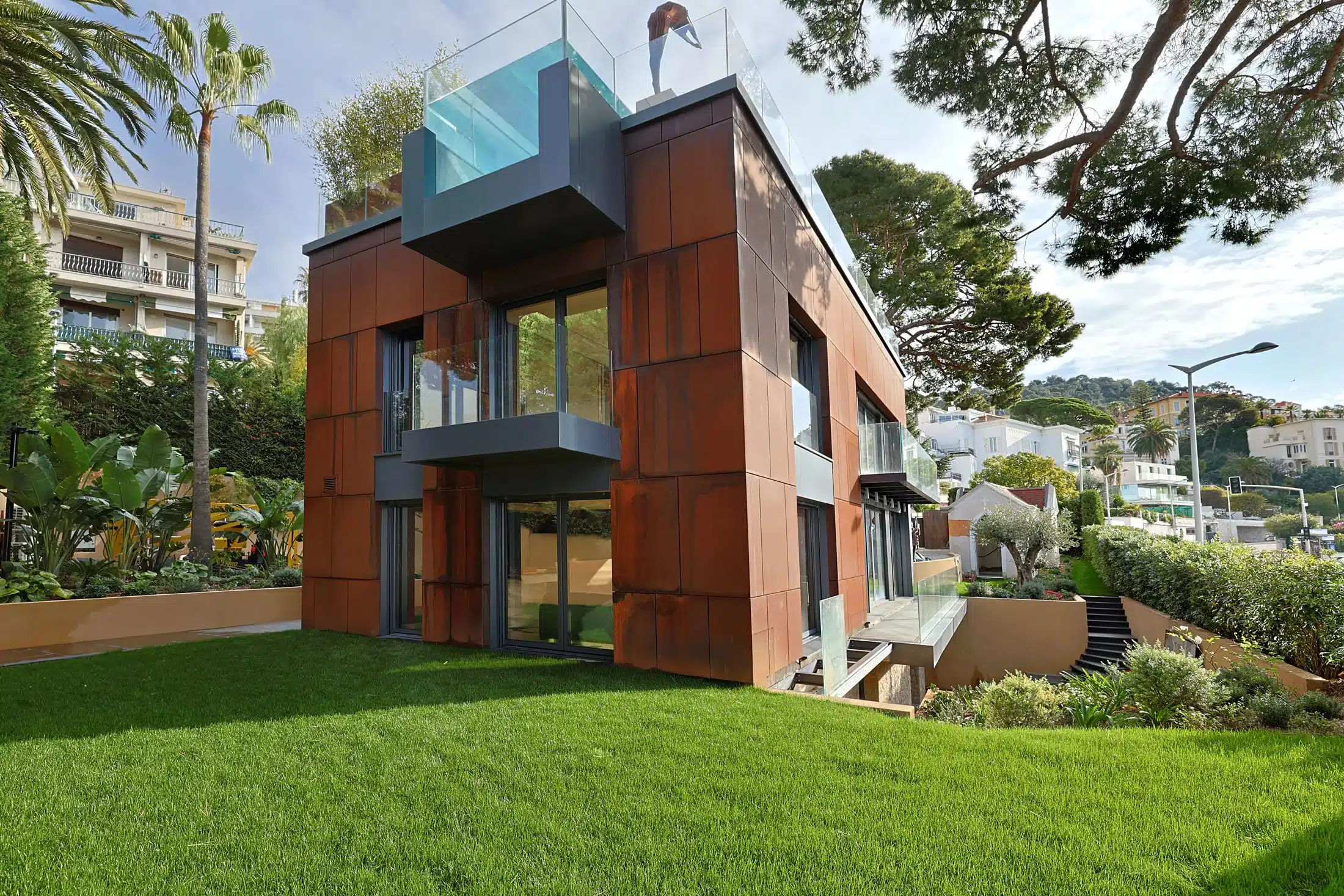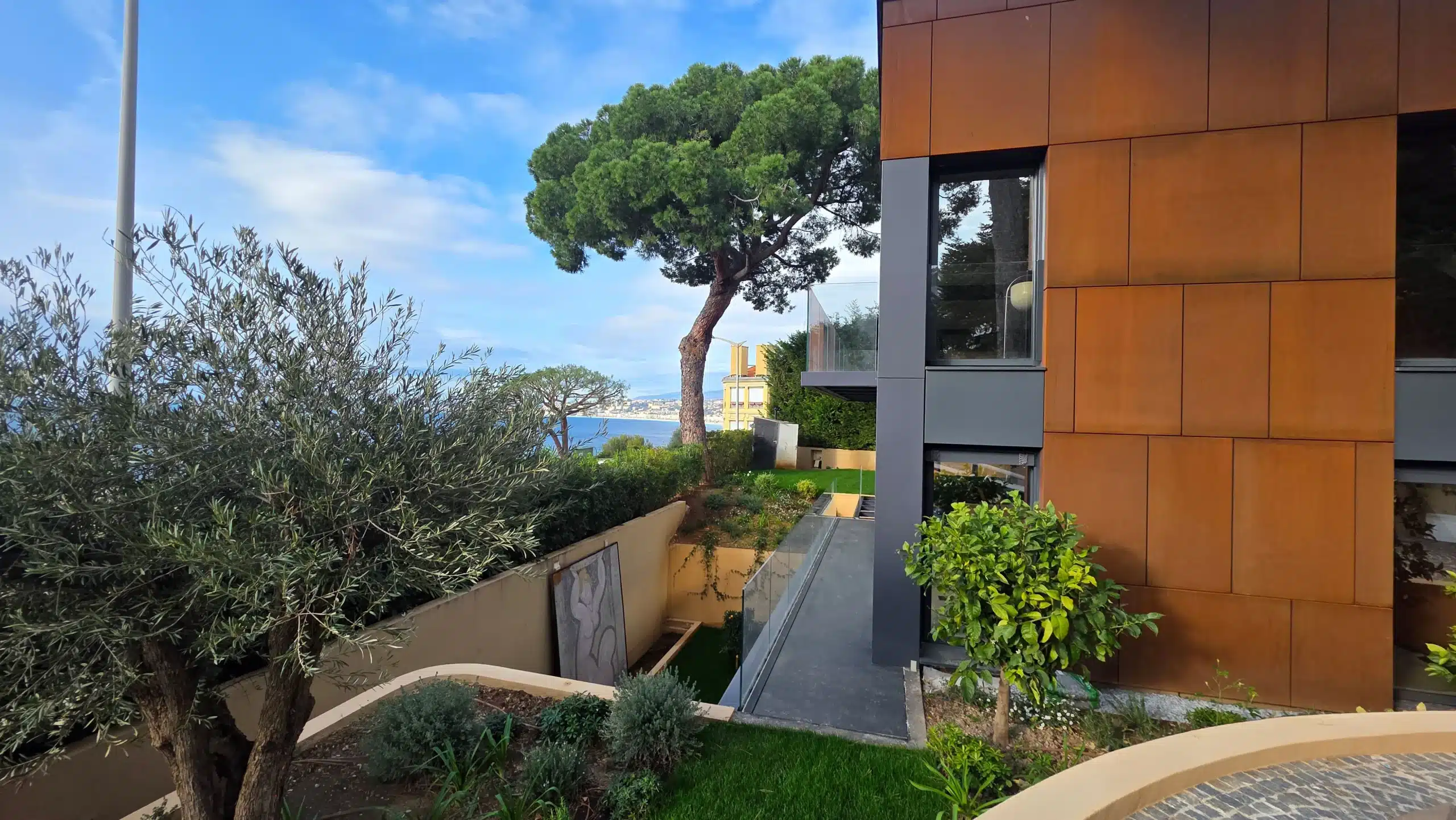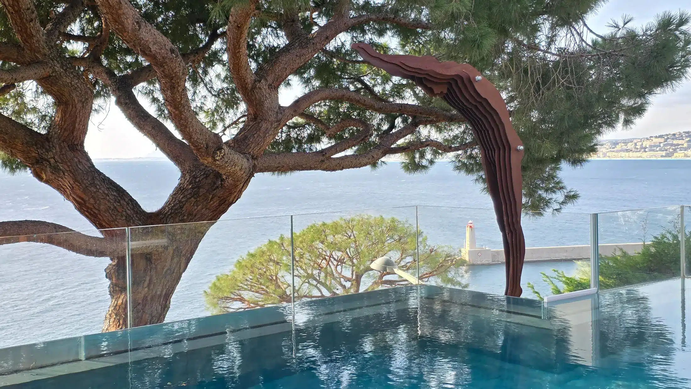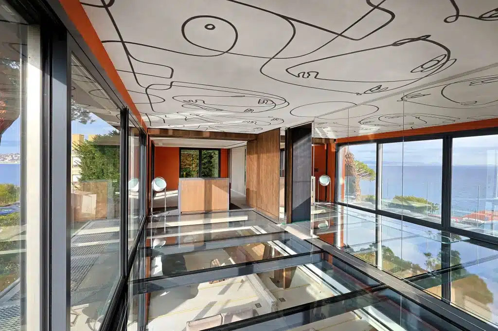 Located on the Basse Corniche in Nice, this plot offers a splendid view of the Mediterranean. With a bay window on the sea side and a blind wall on the rear side, this contemporary villa features a glazed infinity pool, an exceptional architectural element that ornaments the roof like a precious aquamarine gem.