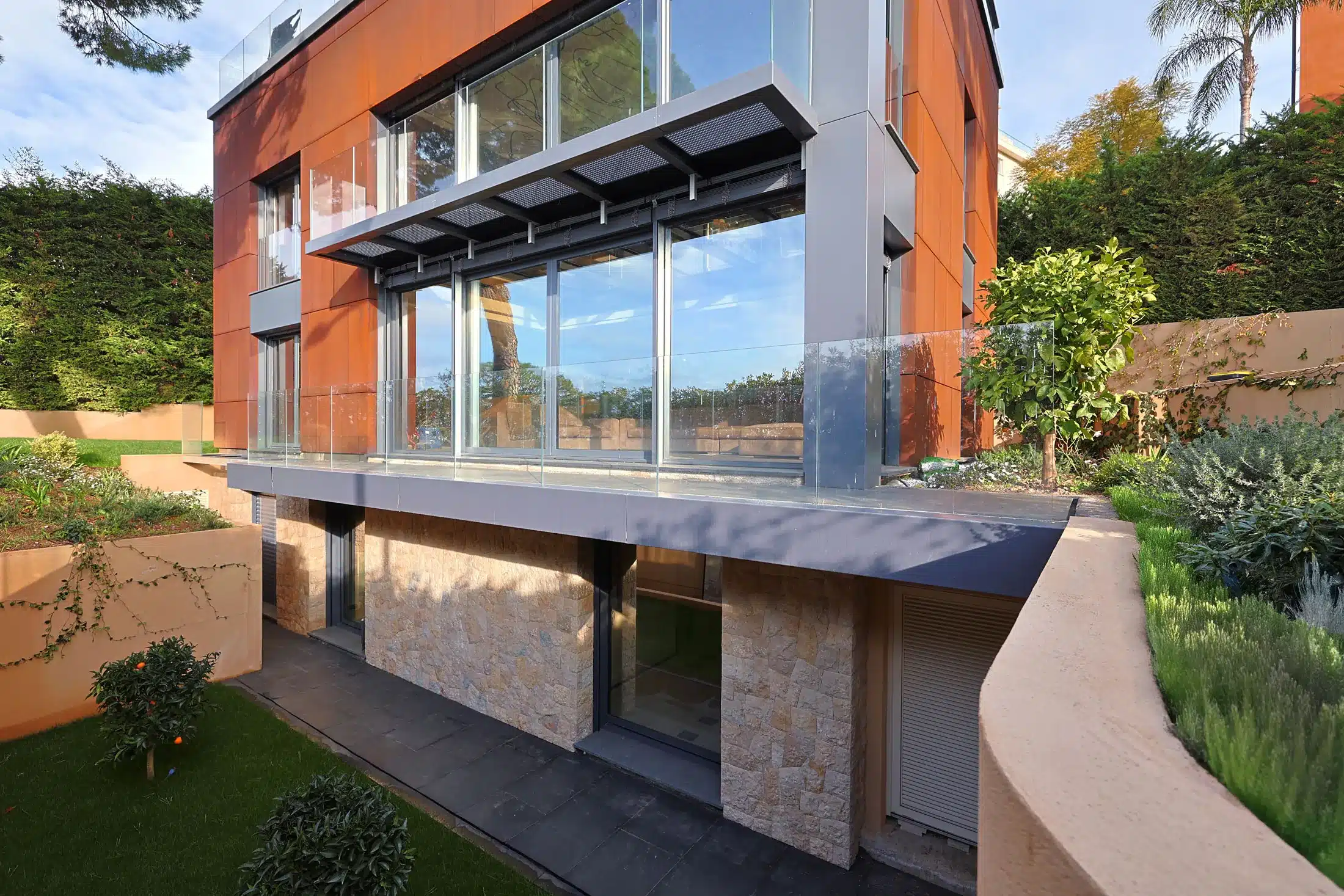 A corten covering allows for a perfect integration into the site, nestled between the proud two hundred-year-old pines. The composition of the facades is further enhanced by the balconies’ self-supporting metal structure.