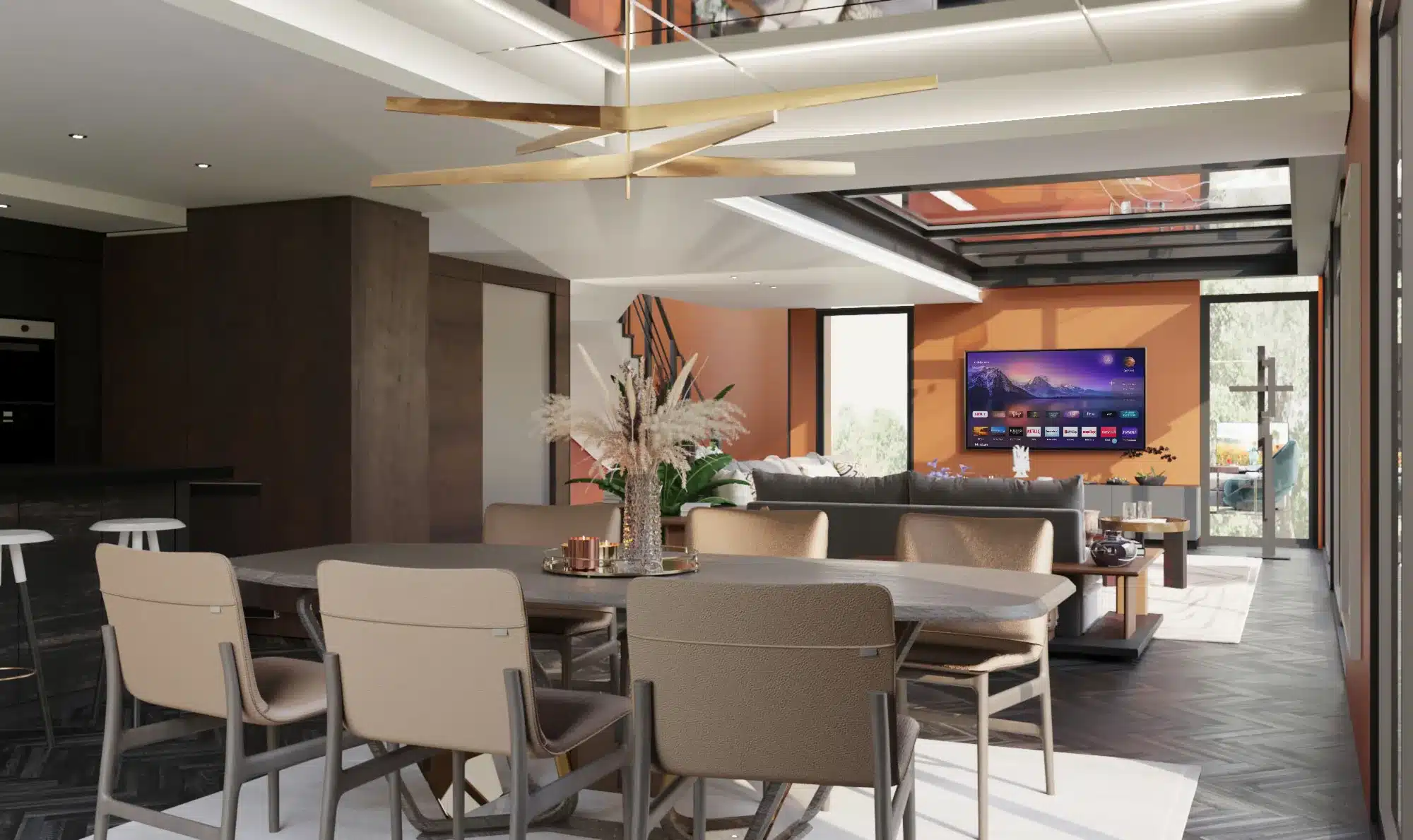 The villa has a sleek interior characterized by white plaster walls, mirrors and primary color combinations; the interior glass floor maintains that double height impression. The invisible entrance door is indicated by a glazed canopy. The project also involves restoration works of an existing chapel on premises.