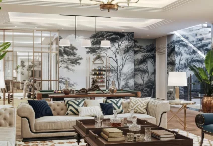 This transparent surface preserves the original double-height space while establishing a strong visual link between levels. Mirrors and a ceiling fresco extend the visual perspective of the space, amplifying the surrounding panorama and creating the sensation of being immersed within the landscape itself.